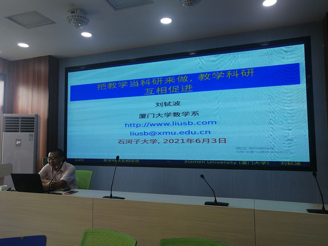 报告题目二:把教学当科研来做,教学科研互相促进。报告内容如下:刘教授结合自己以往的工作经历,介绍由于科学研究而对本科课程“数学分析”的新看法,以及在本科教学过程中提出科研问题、解决问题、形成科研成果并最终将科研成果融入本科教学工作的事例和体会。以此说明教学和科研是可以互相促进的。另外,力图说明在教学过程打破不同课程之间的藩篱、适时地运用其他课程的理论和方法,往往能简化本门课程的论证,